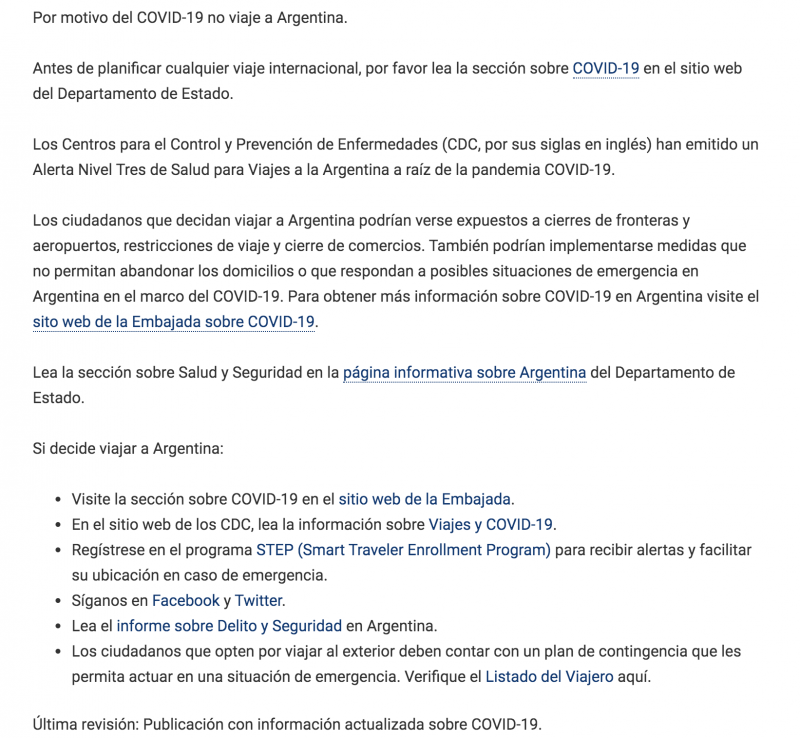 Los Centros para el Control y Prevención de Enfermedades (CDC, por sus siglas en inglés) han emitido un Alerta Nivel Tres de Salud para Viajes a la Argentina a raíz de la pandemia COVID-19.