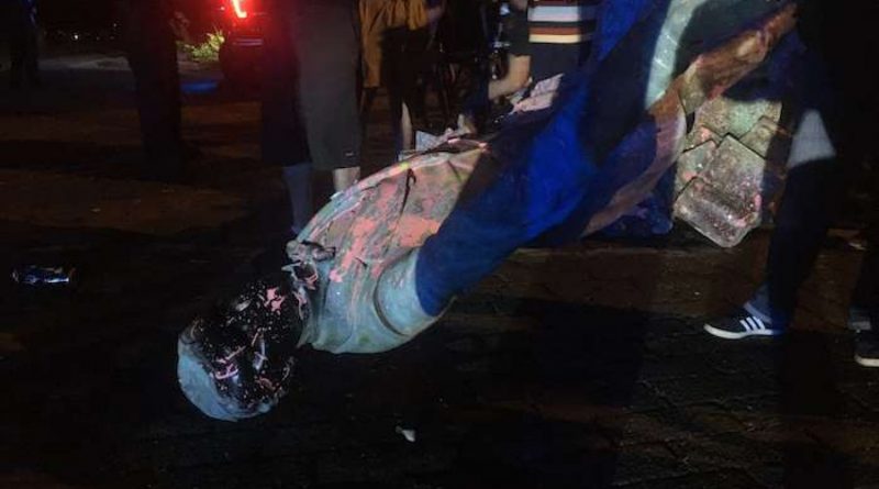 Gritos indignados surgieron desde la pacífica y diversa multitud cuando un pequeño grupo de personas blancas de extrema derecha se subió a un edificio que daba a la protesta y desplegó una enorme pancarta que decía “racismo anti-blanco”.