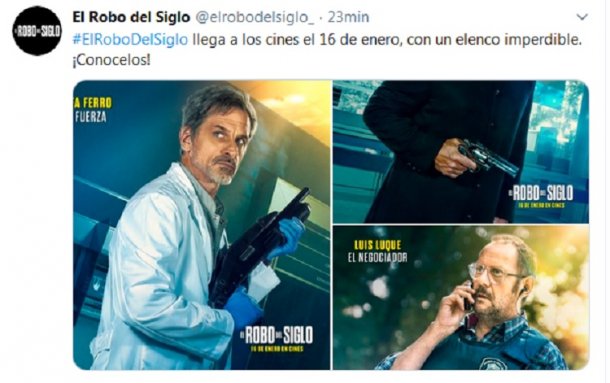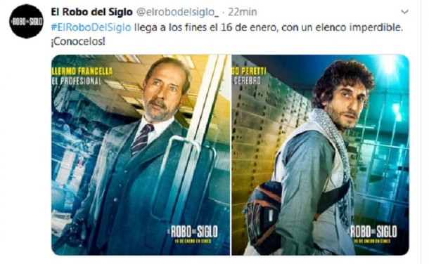 El primer gran estreno del cine argentino en 2020 tendrá lugar el 16 de enero, cuando se pueda ver El robo del siglo, película protagonizada por Guillermo Francella y Diego Peretti, que recrea el famoso robo de la sucursal del banco Río de la localidad bonaerense de Acassuso el 13 de enero de 2006, la cual fue asaltada por una banda de seis ladrones armados con armas de juguete. Tomaron 23 rehenes y se llevaron 15 millones de dólares.