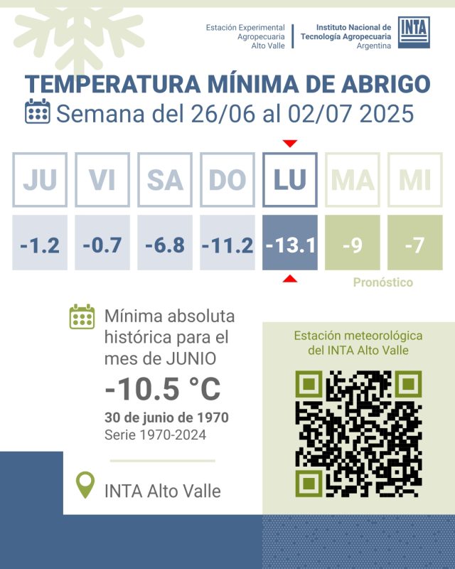 El Instituto Nacional de Tecnología Agropecuaria del Alto Valle compartió un informe sobre las temperaturas registradas desde el 26 de junio y confirmó que la más extrema fue la de este 30 de junio que marcó -13.1 °C.