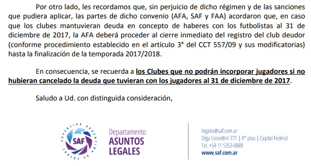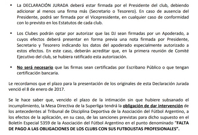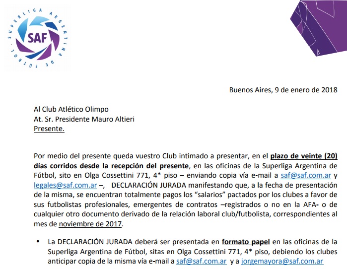 Olimpo recibió en las últimas horas un escrito por parte del Departamento de Asuntos Legales de la Superliga donde se lo obliga a pagar los meses atrasados a los jugadores (noviembre y diciembre más el aguinaldo) para poder utilizar a los refuerzos en la reanudación del torneo.
