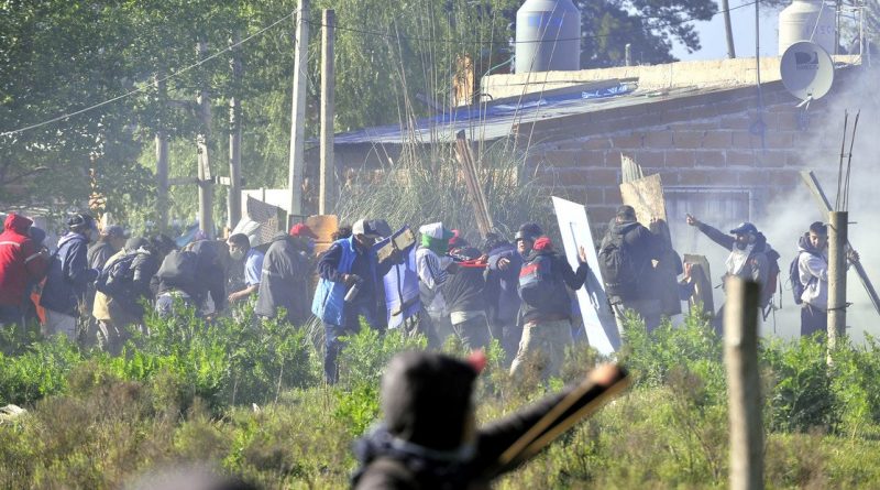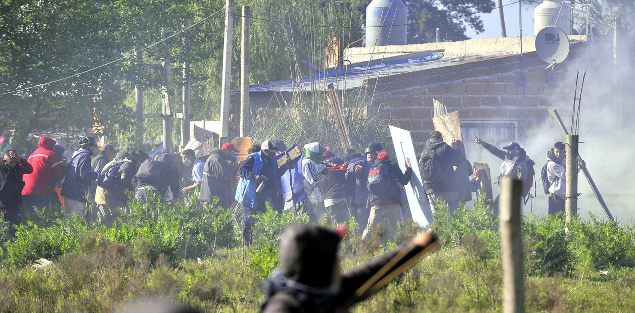 Los disturbios en Guernica ocurrieron a unas tres cuadras del campo, cuando grupos resistían el desalojo tirando piedras a las fuerzas de seguridad, que utilizaron gases lacrimógenos y se desplazaron a pie y a bordo de cuatriciclos para dispersarlos.