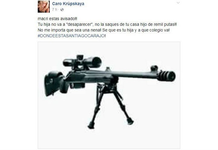 “Macri estás avisado!! Tu hija no va a “desaparecer”, no la saques de tu casa hijo de remil putas!! No me importa que sea una nena! Se que es tu hija y a que colegio va #DONDEESTASANTIAGOCARAJO”, fue el mensaje que apareció, junto a una foto de un fusil, en la cuenta del usuario “Caro Krúpskaya”, a quienes en las redes sociales vinculan a Carolina Pavlovsky, hija del actor Eduardo ‘Tato’ Pavlovsky. Aunque, vale la aclaración, la cuenta no estaba verificada. Y, sugestivamente, esta mañana fue eliminada de Facebook.