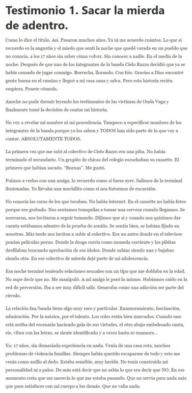 Así arranca el Testimonio 1 del blog Denuncias Cielo Razzo, abierto en estas horas para que las “víctimas de la banda rosarina” cuenten, de manera anónima, las traumáticas experiencias que habrían vivido con los músicos del grupo. Por esta misma modalidad, los integrantes de Onda Vaga recopilaron en una semana más de 40 acusaciones en su contra por abuso sexual, en la mayoría de los casos, cuando las denunciantes eran adolescentes. Y también en Internet y desde el anonimato se hicieron las primeras denuncias contra Cristian Aldana: hoy en prisión, el cantante de El Otro Yo enfrenta un juicio oral por presunto abuso de siete menores de edad.