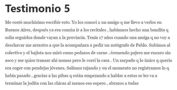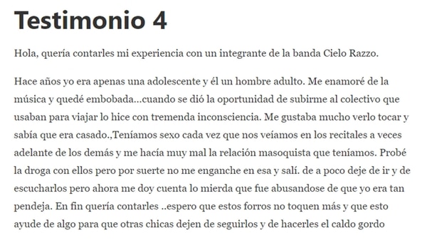 La joven del Testimonio 1 contra Cielo Razzo señala a “absolutamente todos” los músicos del grupo de rock. Y explica que, cuando sucedió todo, “era una piba que no había terminado el secundario”. Sin precisar el año, viajó con una amiga a un show en el Interior (tampoco especifica el lugar). Los músicos se acercaron a ellas cuando las vieron tomando una cerveza. Luego del recital, las invitaron a subir al micro que trasladaba a la banda.