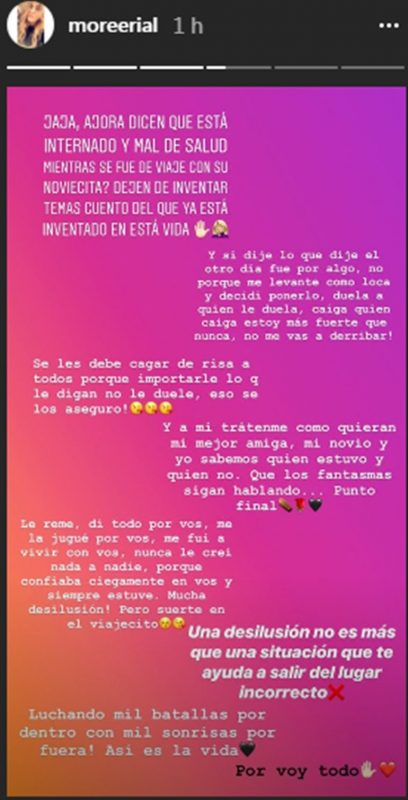Y si dije lo que dije el otro día fue por algo, no porque me levanté como loca y decidí ponerlo. Duela a quien le duela, caiga quien caiga. Estoy más fuerte que nunca, ¡no me van a derribar! La remé, di todo por vos, me fui a vivir con vos. Nunca le creí nada a nadie porque confiaba ciegamente en vos y siempre estuve. Mucha desilusión pero… ¡suerte en el viajecito!“, continuó ofuscada.