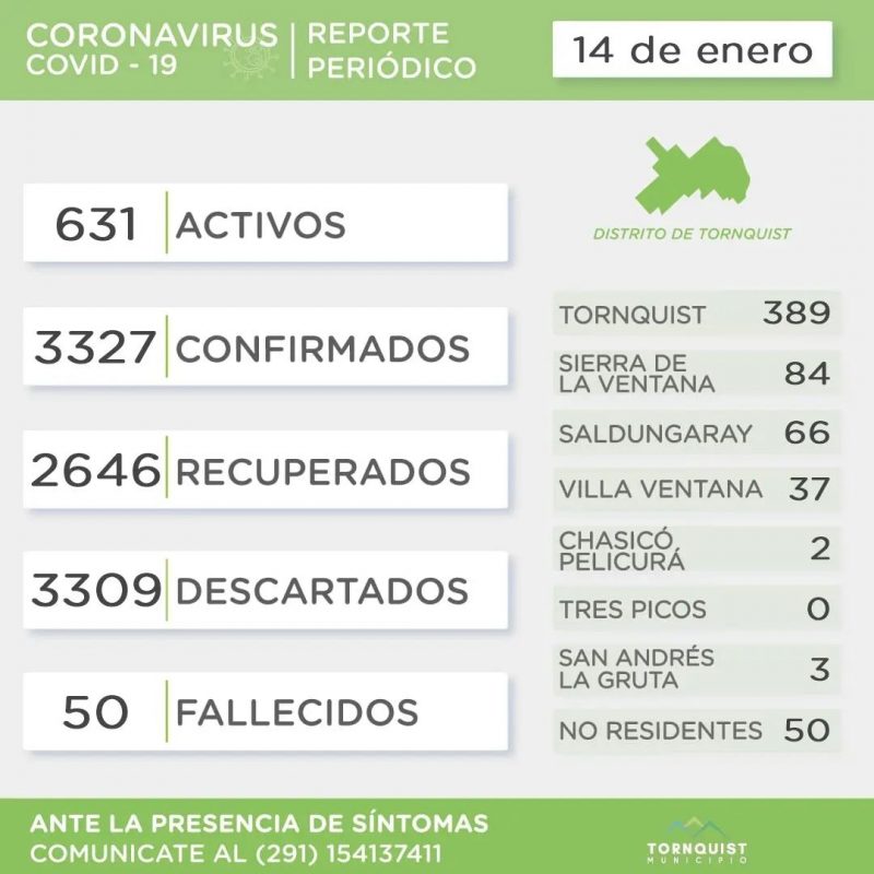 El municipio de Tornquist anunció que hay 631 casos activos de covid-19 en ese distrito, 81 más que ayer, de los cuales 389 son de la ciudad cabecera.