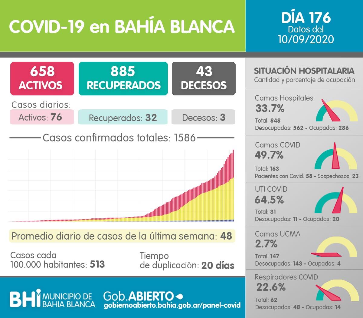 Se confirmaron 76 casos nuevos, 3 decesos y 32 recuperados de coronavirus en Bahía Blanca, informó el Comité de Contingencia local.