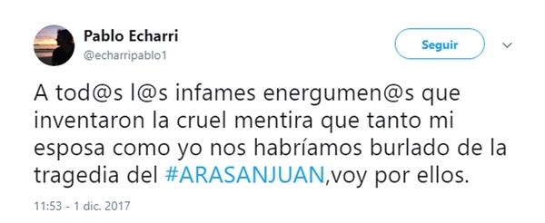 Horas antes había usado su cuenta de Twitter para referirse al tema: “A todos los infames energúmenos que inventaron la cruel mentira, que tanto mi esposa como yo nos habríamos burlado de la tragedia del ARA San Juan, voy por ellos”. (Infobae)