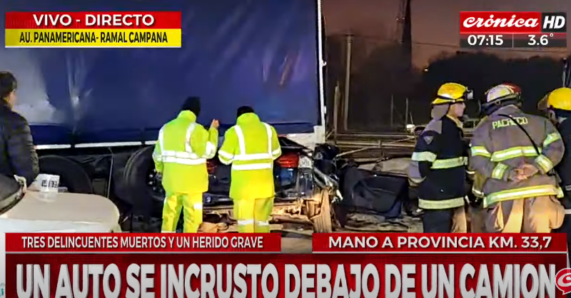 Como resultado de una violenta persecución policial que se inició esta madrugada en el partido de Tigre, provincia de Buenos Aires, un automóvil terminó incrustado debajo de un camión en el ramal Campana de la autopista Panamericana, y tres de sus ocupantes murieron en el acto.