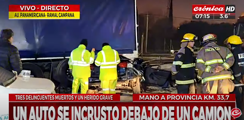 Como resultado de una violenta persecución policial que se inició esta madrugada en el partido de Tigre, provincia de Buenos Aires, un automóvil terminó incrustado debajo de un camión en el ramal Campana de la autopista Panamericana, y tres de sus ocupantes murieron en el acto.