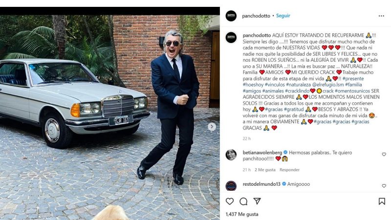En su cuenta de Instagram, Pancho Dotto compartió un movilizante posteo tras dar positivo al test de coronavirus: “Aquí estoy tratando de recupararme! Siempre les digo que tenemos que disfrutar mucho mucho de cada momento de nuestras vidas. Que nada ni nadie nos quite la posibilidad de ser libres y felices, que no nos roben los sueños ni la alegría de vivir“, indicó.