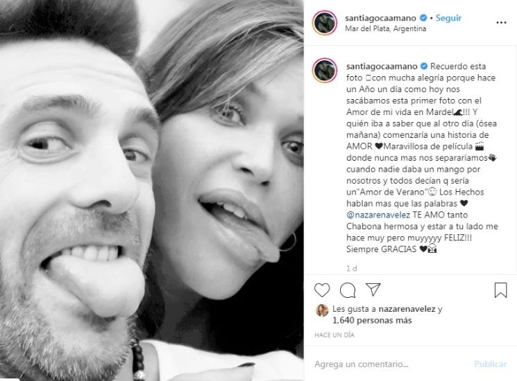 Tiempo después, el protagonista de “Él en mi cuerpo” compartió un dulce posteo con su pareja. “Recuerdo esta foto con mucha alegría porque hace un año, un día como hoy, nos sacábamos esta primera foto(sic) con el amor de mi vida en Mardel. Y quién iba a saber que al otro día (ósea mañana) comenzaría una historia de amor maravillosa de película, donde nunca más nos separaríamos. Cuando nadie daba un mango por nosotros y todos decían que sería un amor de verano”, manifestó.