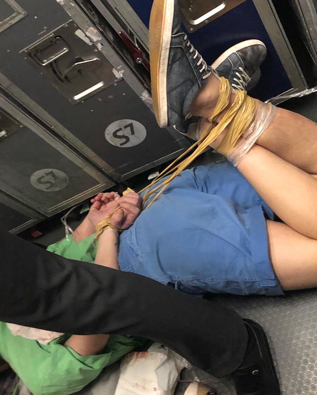 Las imágenes del incidente fueron publicadas por un testigo en su cuenta de Instagram. En el material gráfico se aprecia el momento en que varios pasajeros colaboran entregando sus cinturones y cinta adhesiva para atar de pies y manos al agresor, quien posteriormente aparece tendido en el piso de la cabina.