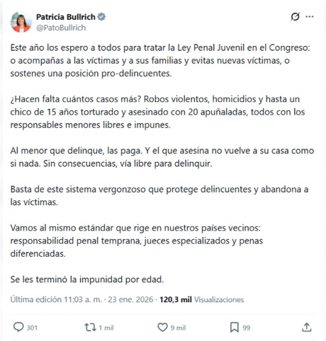 “Este año los espero a todos para tratar la Ley Penal Juvenil en el Congreso: o acompañás a las víctimas y a sus familias y evitas nuevas víctimas, o sostenés una posición pro-delincuentes”, expresó con tono categórico.