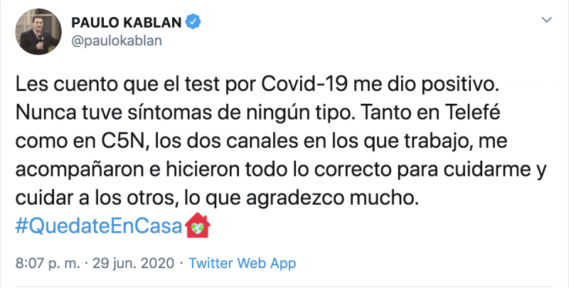 De esta manera, se conoció que Paulo Kablan, el periodista de policiales que integra el show del mediodía, dio positivo por Covid-19. Kablan también forma parte del noticiero de C5N. La información fue dada a conocer por el portal PrimiciasYa.