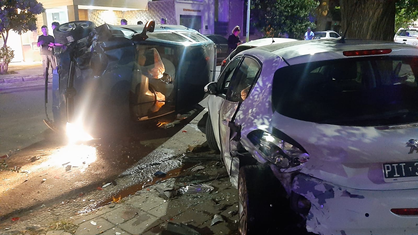 El automóvil impactó contra tres rodados estacionados —un Ford Focus Exe, un Peugeot 208 y otro Ford Focus— y terminó volcado sobre la calzada.