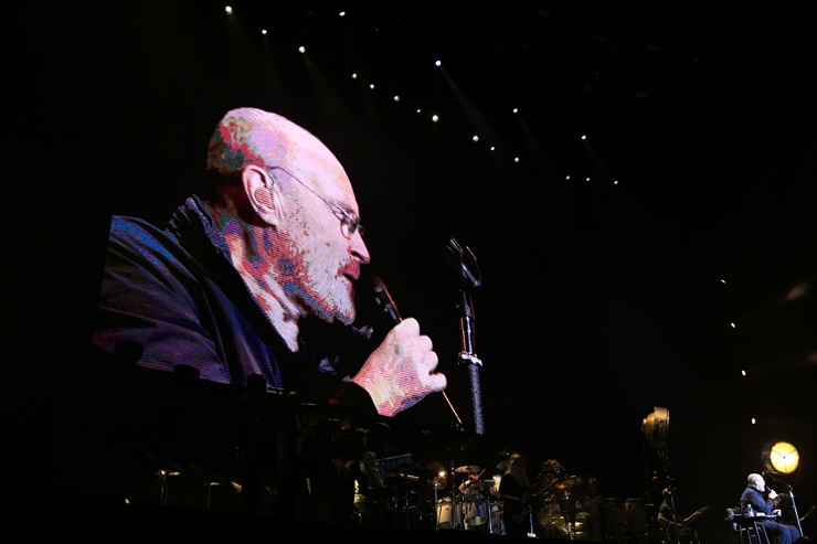 El repertorio de Collins es un grandes éxitos que va de los lentos a los rápidos y de ahí a los de medio tempo, con canciones de su discografía solista y de Genesis. Por eso del R&B vira rápidamente a “Throwing It All Away”. Ningún especialista en grandes recitales le recomendaría salir de gira a un hombre que ha pasado por problemas de salud difíciles de sobrellevar, de un retiro de los escenarios que lo ha dejado fuera de forma y de la decisión de regresar con un bastón. Su gira se llama Not Dead, Yet Alive (no muerto, aún vivo). Esa fue la primera señal que dio antes de comenzar sus tours. Canta todo el recital sentando. Pero eso no hace una gran diferencia. Cuando tomó el lugar de frontman en Genesis, tras la partida de Peter Gabriel, para el disco A Trick of the Tail, no era el gran showman que saltaba de acá para allá sobre el escenario. Cantaba con las manos en los bolsillos. Ahora tampoco; lo suyo es como volver a esa experiencia, aunque con otro camino recorrido.Ya no tiene a Chester Thompson para hacer duelos de batería. De hecho, no puede tocar la bata en vivo. Pero está bien acompañado. Tiene a uno de sus hijos -Nicholas, que a los 16 años toca los temas tal cual los grabó su padre, hace treinta o cuarenta años- sentado tras los cascos y platillos, y a laderos que son viejos compañeros de ruta, como el guitarrista Daryl Stuermer y el bajista Leland Sklar además de sólidas secciones de coros y vientos. Su carrera tuvo proyectos con arreglos de secciones de brasses que no se volvieron a repetir jamás en la música pop.