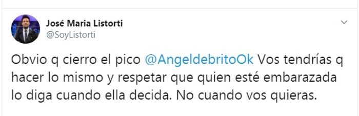 “Son cosas en la que justamente hay que respetar la decisión de las persona involucradas. Si tenés una enfermedad, ¿yo lo voy a decir?”, preguntó José María, frase que fue rápidamente respondida por su compañera, Denise Dumas, que defendió a De Brito diciendo que un embarazo es una buena noticia.