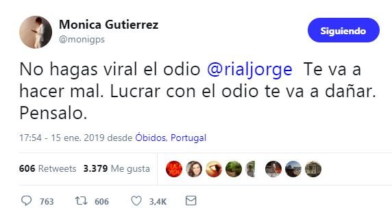 “No hagas viral el odio @rialjorge Te va a hacer mal. Lucrar con el odio te va a dañar. Pensalo”, le escribió a modo de recomendación. Horas más tarde, el conductor replicó con un mensaje contundente.