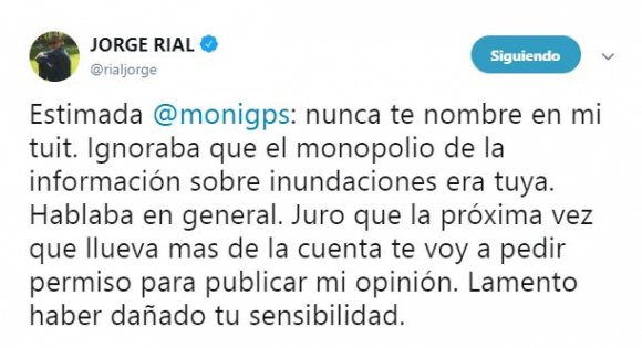 “Estimada @monigps: nunca te nombre en mi tuit. Ignoraba que el monopolio de la información sobre inundaciones era tuya. Hablaba en general. Juro que la próxima vez que llueva mas de la cuenta te voy a pedir permiso para publicar mi opinión. Lamento haber dañado tu sensibilidad”, concluyó.