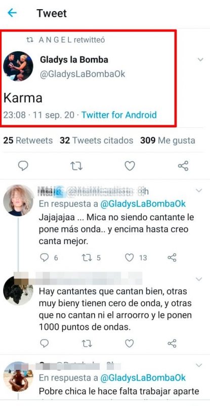 Del otro lado de la pantalla y tras hacer público en más de una oportunidad su cero empatía por Viciconte, Gladys la Bomba Tucumana tuiteó tras la performance de Mica y le dedicó un indirecto, pero explosivo tweet. “Karma“, sintetizó la cantante, al ver la actuación de Mica y la contundente devolución de jurado, que la dejó prácticamente en la sentencia.