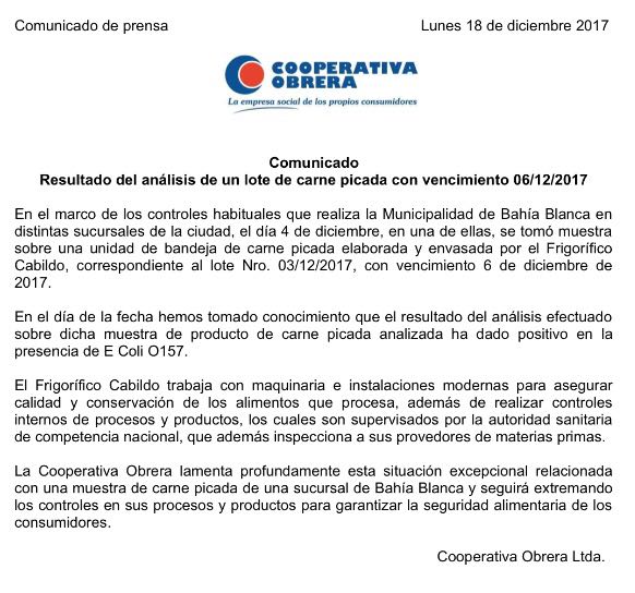 EL COMUNICADO DE LA COOPERATIVA OBRERA