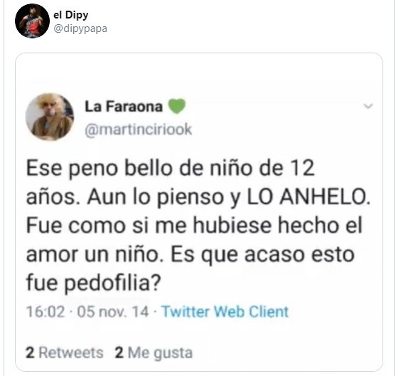 Luego de que se viralizaran sus polémicos tuits en los que afirmaba comentarios como “Ese peno bello de niño de 12 años Aún lo pienso y lo anhelo. Fue como si me hubiese hecho el amor un niño. Es que acaso esto fue pedofilia?”.