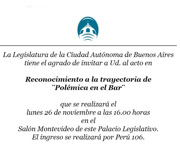 Un motivo de orgullo para todos nosotros, todos los que hacemos Polémica en el bar, para la memoria de Gerardo Sofovich que tan bien y tan alta la mantiene su hijo Gustavo, tenemos el honor de mostrar este galardón que va a suceder en unos días“, dijo contento Mariano Iúdica al frente del programa y mostró la invitación al evento que se realizará la semana que viene.