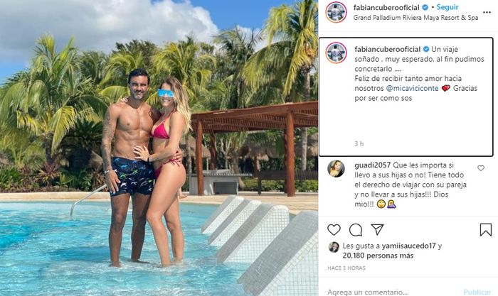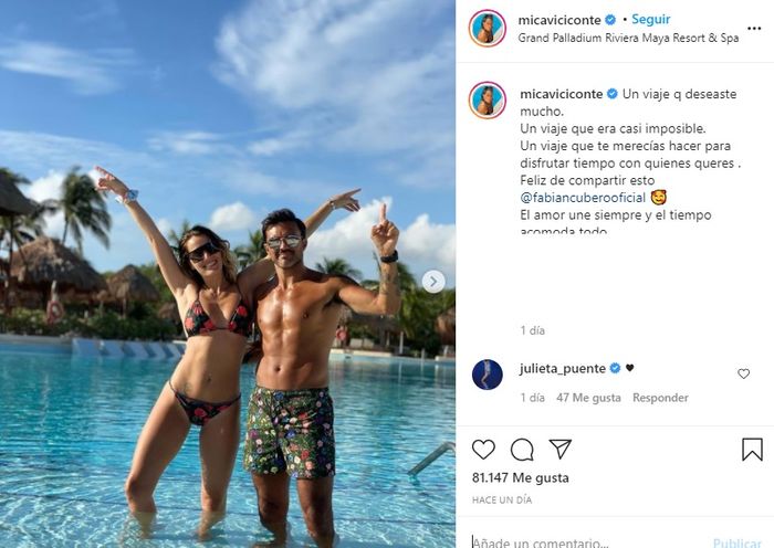 El ex futbolista, por su parte, comentó en otra imagen: “Un viaje soñado , muy esperado, al fin pudimos concretarlo… Feliz de recibir tanto amor hacia nosotros @micaviciconte. Gracias por ser como sos“.