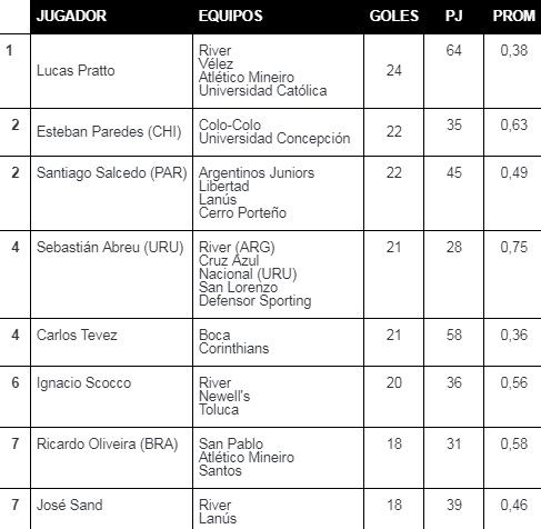En actividad, los siguen Santiago Salcedo y Esteban Paredes, con 22. Del fútbol argentino, Carlos Tevez tiene 21 tantos, Ignacio Scocco, con 20, y José Sand, con 18 goles.
