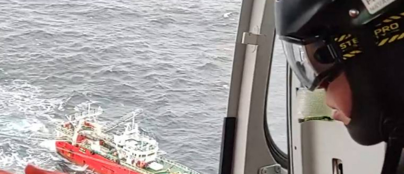 A su vez, despegó el helicóptero con la médica y nadadores de rescate a bordo. Ya sobre el buque, el personal descendió una canasta sanitaria e izó al tripulante, quien recibió las primeras asistencias a bordo.