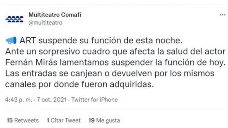 Horas antes, desde la cuenta Multiteatro Comafi, manejada por el productor teatral Carlos Rottemberg, informaron que “ART suspende su función de esta noche. Ante un sorpresivo cuadro que afecta la salud del actor Fernán Mirás lamentamos suspender la función de hoy. Las entradas se canjean o devuelven por los mismos canales por donde fueron adquiridas“, decía el mensaje sin brindar mas detalles sobre el estado del actor de 52 años de edad.