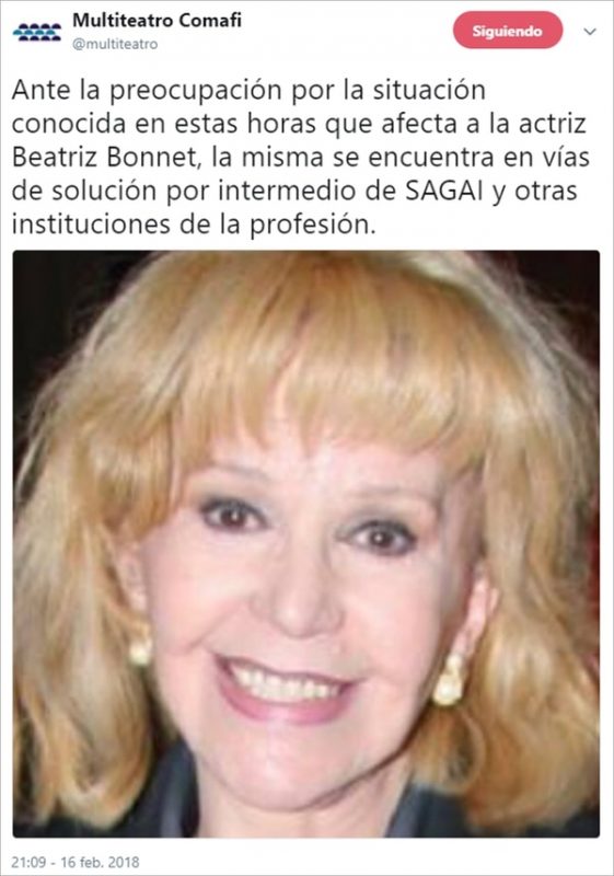 Con una deuda de 38 mil pesos con el geriátrico que la aloja y, por falta de pago, sin la cobertura de la prepaga que le brindaba prestación médica, el presente de Beatriz Bonnet mantiene en alerta a gran parte del ambiente artístico.