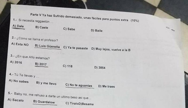 Muchas de estas preguntas eran letras de reggaeton. Los alumnos solo tenían que seleccionar la alternativa correcta, la cual completaba la canción. Por ejemplo, la pregunta uno decía “Si necesita reggaetón,….”. Las alternativas eran dale, caele, sabe, baile. De estas la correcta era “dale” puesto que así dice la canción Ginza de J Balvin.