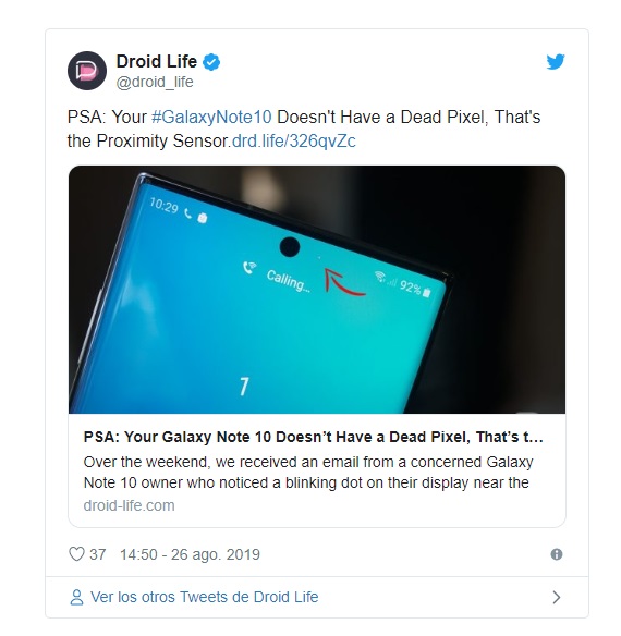 Cabe notar que el punto brillante en Galaxy Note 10 solamente aparece cuando se realiza una llamada. Ese dato fue la pista fundamental para descubrir el misterio: el circulito que reluce en, en verdad, un sensor de proximidad óptico.