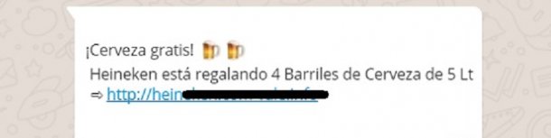 Un nuevo mensaje engañoso, el cual resulta ser muy tentador, se viralizó en todo el mundo en las últimas horas por WhatsApp. En el mismo, aseguran que la marca de cervezas Heineken está regalando 4 barriles de 5 litros de cerveza con sólo entrar a un link que se adjunta.