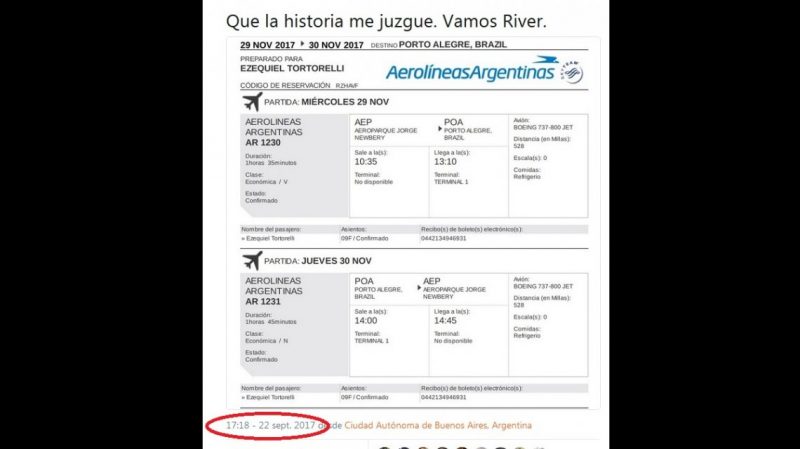“Que la historia me juzgue. Vamos River”, dijo con una foto de los pasajes. Ezequiel Tortorelli, tal es su nombre real, puede viajar el 29 de noviembre y volver el 30 tras haber comprado un pasaje a bajo costo pero para ver a Lanús.