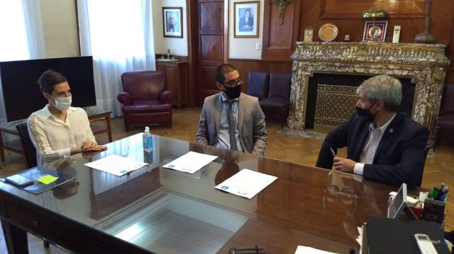 El rector doctor Daniel Vega y Rodrigo Aristimuño -gerente del Consorcio de Gestión del Puerto de Coronel Rosales- mantuvieron este martes una reunión en el rectorado, en la que también participó la subsecretaria de Vinculación Tecnológica de esta Casa, doctora Paula Messina. Se firmó un acuerdo de cooperación que luego será rubricado por el presidente de la Comisión de Investigaciones Científicas de la Provincia de Buenos Aires (CIC).