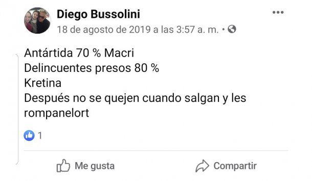 “La última vez voté a Mauricio Macri. Si fuera él estaría con mi mujer tranquilo en Miami, como está ahora”, decía en ese entonces y, en referencia a la vicepresidenta de la Nación Cristina Kirchner, agregaba: “Estamos en manos de una psicópata, del hijo y de su pandilla”.