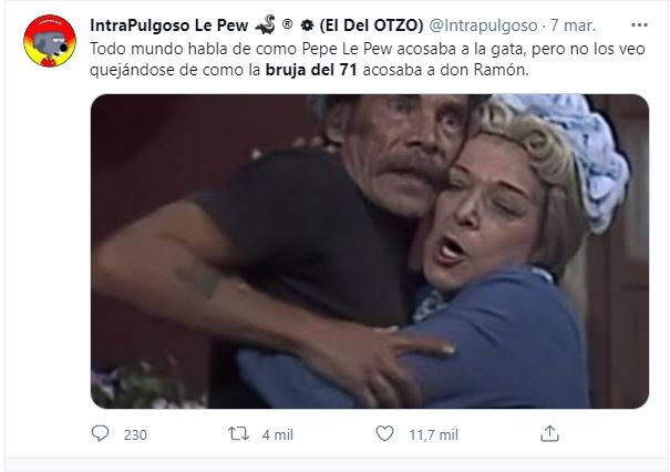 Todo el mundo habla como Pepe Le Pew acosaba a la gata, pero no los veo quejándose de como la Bruja del 71 acosaba a Don Ramón“, fue uno de los tuits que encendió la polémica.