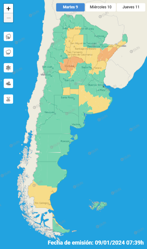 En tanto, la advertencia amarilla se extiende por el sur de Misiones, el resto de Corrientes, centro y norte de Entre Ríos, sur y norte de San Luis, norte de La Pampa, sur de La Rioja, gran parte de Santiago del Estero, Santa Fe, Salta y provincia de Buenos Aires.