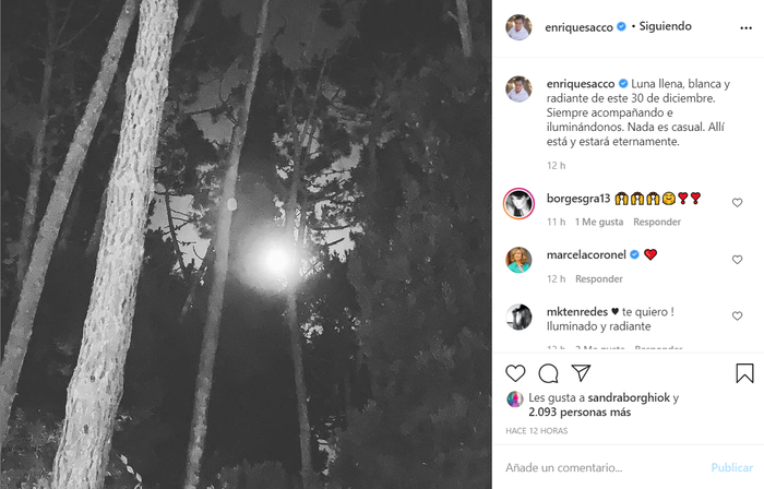 “Luna llena, blanca y radiante de este 30 de diciembre. Siempre acompañando e iluminándonos. Nada es casual. Allí está y estará eternamente“, escribió Sacco junto a la foto.