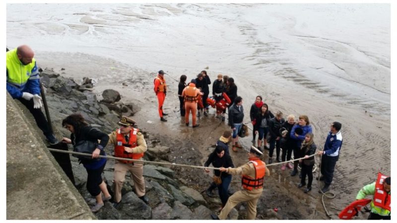 Prefectura inició un operativo de rescate por medio de un cabo de seguridad por el que los pasajeros son guiados a la costa, todos ellos con chaleco salvavidas colocados.