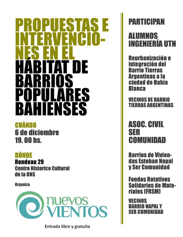 Ayer por la tarde, desde FM De la Bahía dialogamos con Raúl Ayude, ex concejal de nuestra ciudad, hoy parte de la asociación política “Nuevos Vientos”, que nos contó acerca de una intervención que se realizará el Miércoles 6 de Diciembre en Rondeau 29, de 19 a 21, con la intención de “mostrar dos temáticas distintas. Una es el trabajo final de los chicos de ingeniería coordinados por el Ing. Varela, y otra que es la asociación civil Ser Comunidad, que acompaño y ayudó directamente la construcción del barrio natal. Es un grupo de vecinos y técnicos con experiencias realizadas, que quiere dar a conocer este trabajo de diagnostico e intervención”.