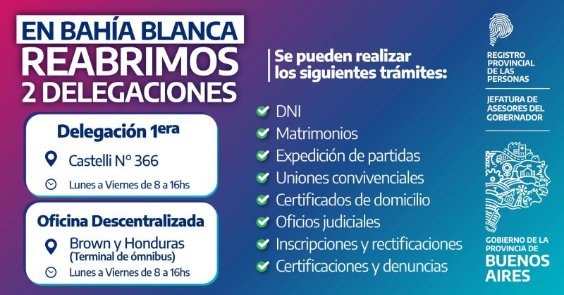 El municipio anunció esta tarde que se habilitaron las oficinas del Registro de las Personas de calle Castelli y la Terminal de Ómnibus, con atención de 8 a 16.