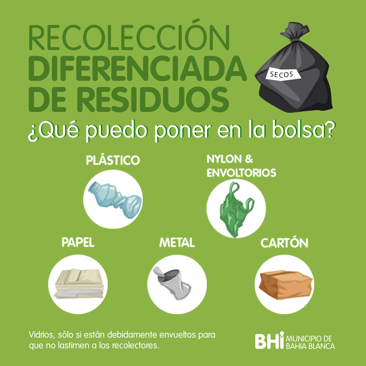 Se solicita colocarle a la bolsa un cartel identificatorio con la palabra ¨SECOS¨ (se puede descargar un sticker en: www.bahia.gob.ar/medioambiente/recolecciondiferenciada/) para poder identificarla.