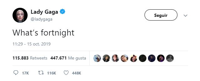 La artista preguntó en Twitter: “What’s fortnight”. Quiso hacer referencia al popular juego en su cuenta pero escribió mal el nombre y sus seguidores quedaron desconcertados. Los usuarios le hicieron saber que el videojuego se llama “Fortnite” y le enviaron capturas del mismo. Los cibernautas argentinos le señalaron que así se llamaba el programa que Ricardo Fort tuvo en la pantalla de América, Fort Night Show, en 2012.