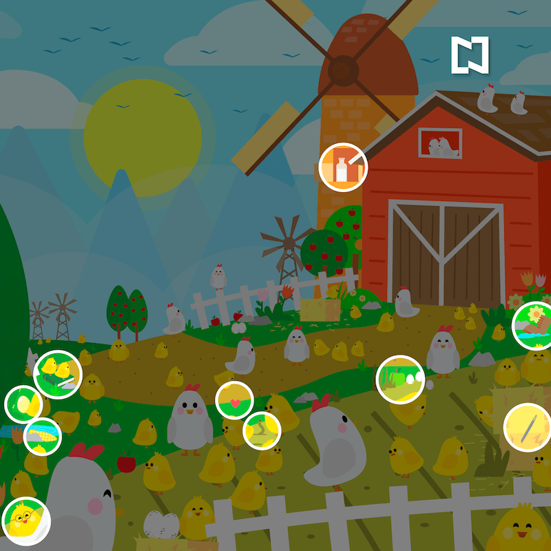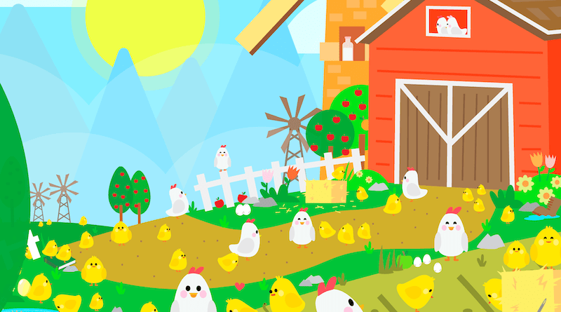 Dicha imagen animada consiste en una granja abierta, llena de animales, gallinas y pollitos, entre los más destacados. Hay diez objetos que son clave para encontrar.
