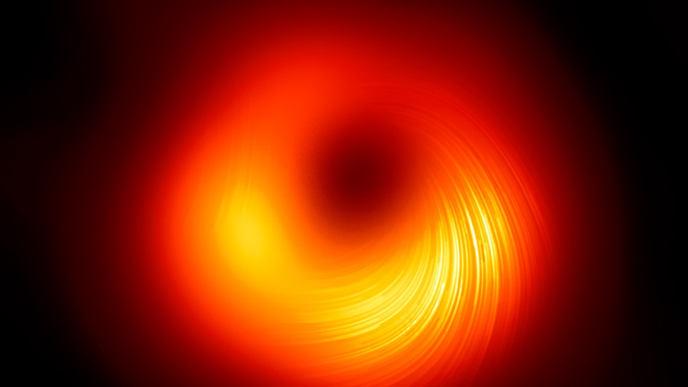 La polarización mostró la estructura del campo magnético situado en los bordes del agujero negro y permitió producir una imagen precisa de su forma, parecida a un torbellino de filamentos.